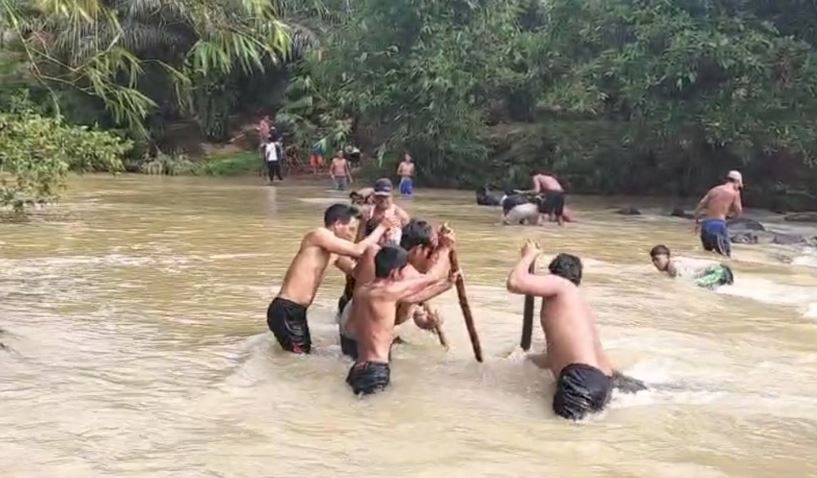 "Pagi ini (Minggu pagi) kami bergotong royong memindahkan batu yang menutupi akases penyebrangan. Karena saat arus sungai besar, banyak batu yang hanyut. Harus dipindahkan agar nanti saat air surut, kendaraan bisa lewat jalur sungai," ujar Aldi Jaya.
