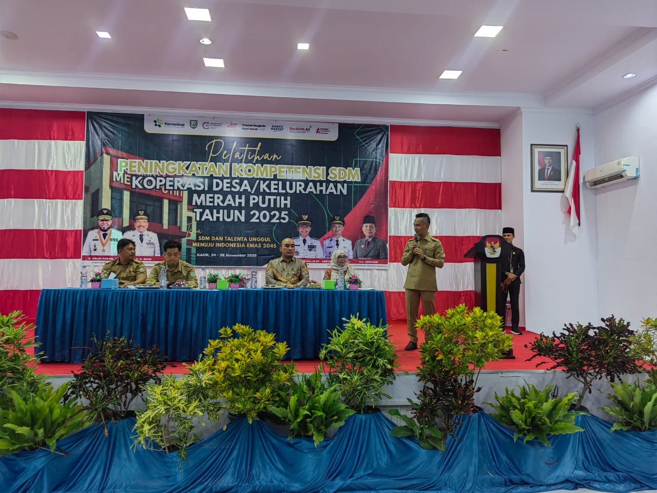 BINTUHAN - Wakil Bupati Kaur, Abdul Hamid S.PdI, menegaskan kepada seluruh peserta pelatihan peningkatan kompetensi SDM pengurus Koperasi Desa dan Kelurahan Merah Putih (KDKMP) di Kabupaten Kaur untuk menyimak materi yang disampaikan oleh narasumber.